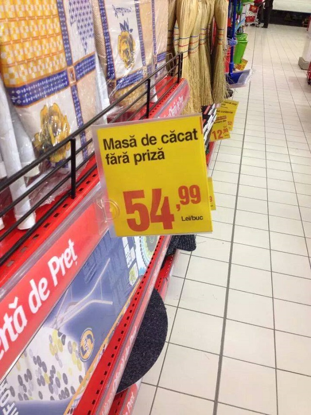 Cei care au mers grăbiţi şi obosiţi la cumpărături au avut parte de un moment care le-a înseninat puţin ziua. Lângă mături, găleţi şi alte produse pentru curăţenie, au observat mai multe mese de călcat. Una dintre ele, care era şi la ofertă, le-a atras atenţia în mod special, dar nu pentru că era diferită de celelalte.