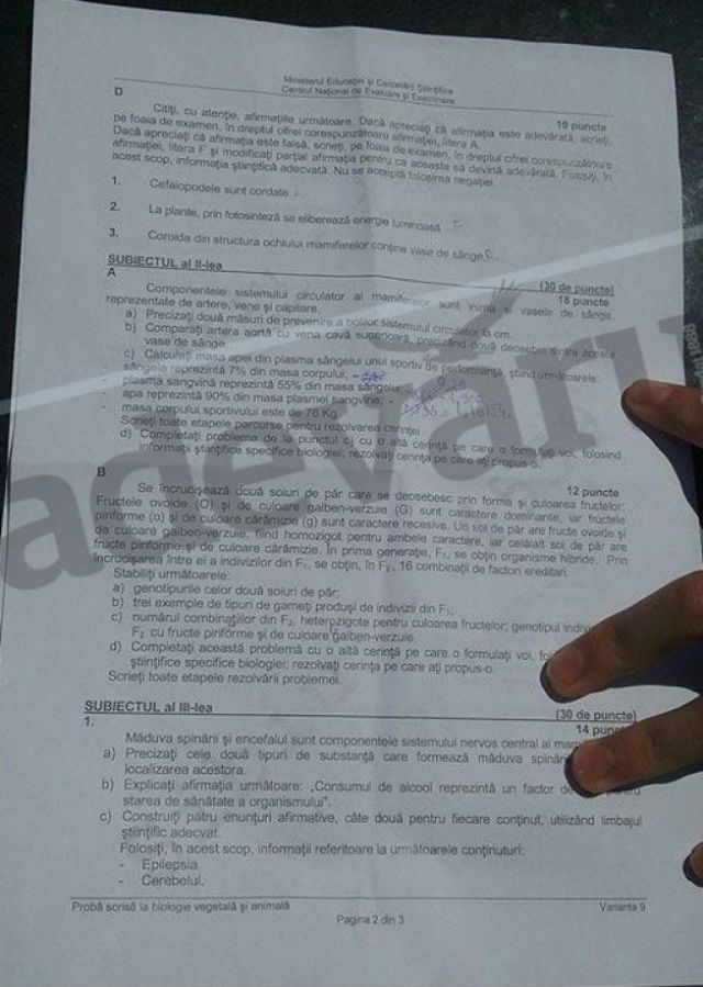 Subiecte Biologie Vegetală. La Biologie vegetală şi animală, elevii au avut de calculat cantitatea de apă din plasma sângelui şi de rezolvat o problemă de monohibridism prin legea a doua a lui Mendel. De asemenea, elevii au mai avut o problemă de genetică şi un mini-eseu despre bolile ereditare.