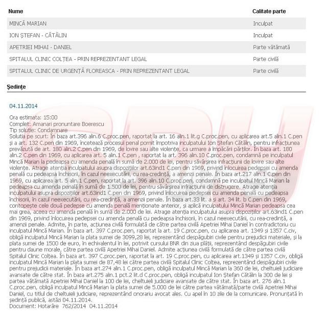 Potrivit deciziei judecătorilor, procesul penal "pornit împotriva inculpatului Ion Ştefan Cătălin, pentru infracţiunea (...) de lovire sau alte violenţe" încetează ca urmare a împăcării părţilor.