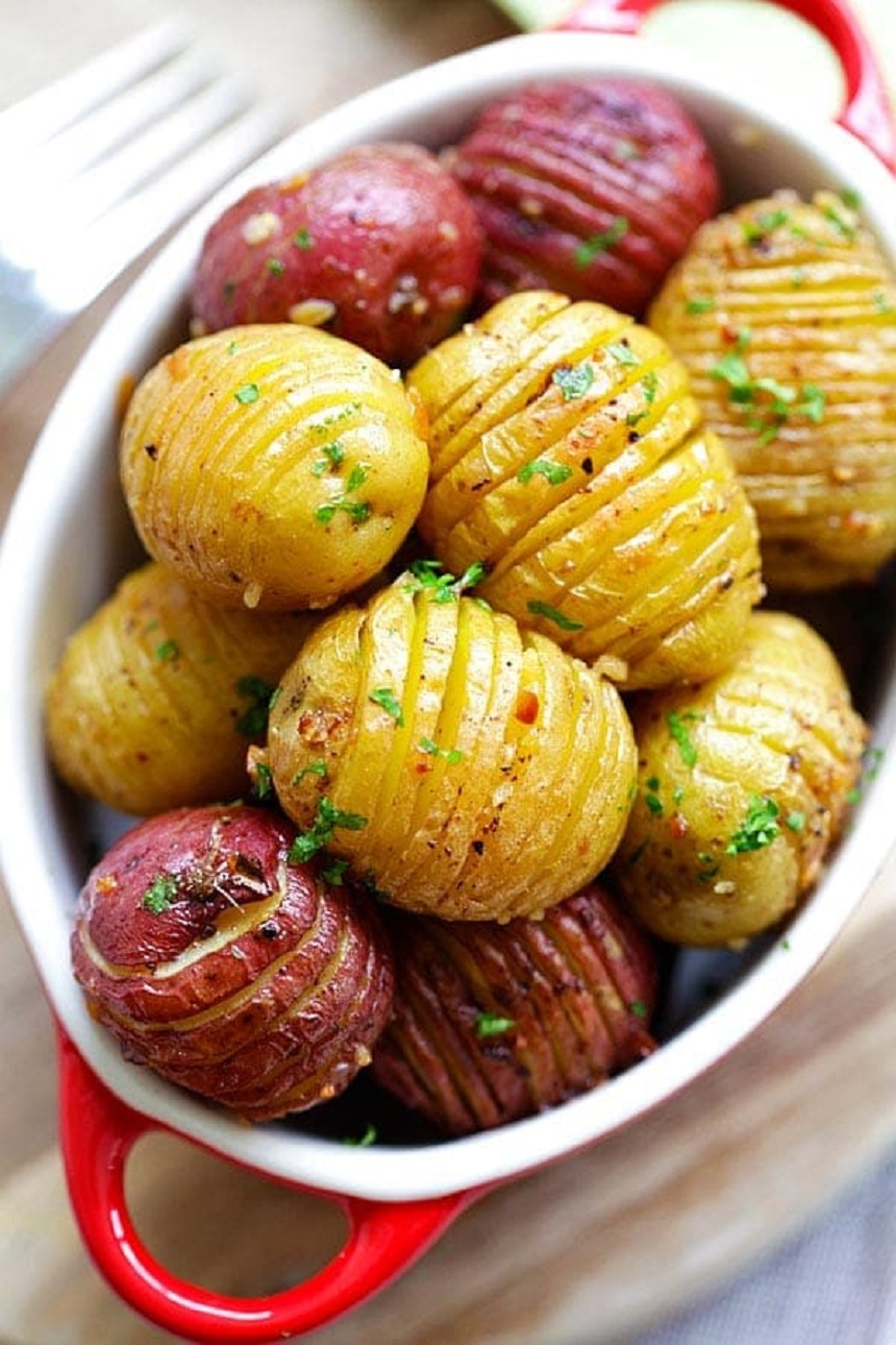 Se prîncălzește cuptorul la o temperatură de 180 de grade. Cu un cuțit se crestează fiecare cartof. Într-un castron mic, se combină, untul, uleiul de măsline, usturoiul, fulgii de ardei, sarea și piperul. Se toarnă amestecul obținut peste cartofi, se amestecă bine până ce aceștia sunt acoperiți în totalitate. Se transferă cartofii într-o tavă de copt. Se gătesc timp de 20 de minute. După care se scot din cuptor se rotesc și se reintroduc în cuptor pentru încă 20 de minute. După ce aceștia sunt gata se asezonează cu pătrunjel și busuioc. Se servesc imediat.