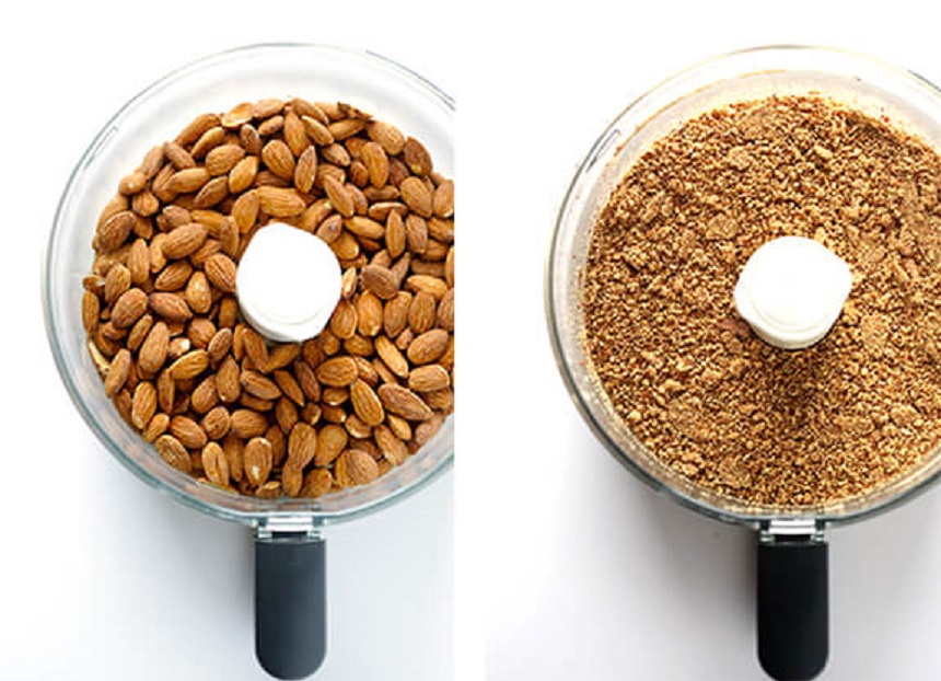 Într-un vas mare, se amestecă migdalele mărunțite cu untul topit până ce se obține un amestec omogen, apoi se întinde în mod uniform în partea inferioară a tăvii de copt.