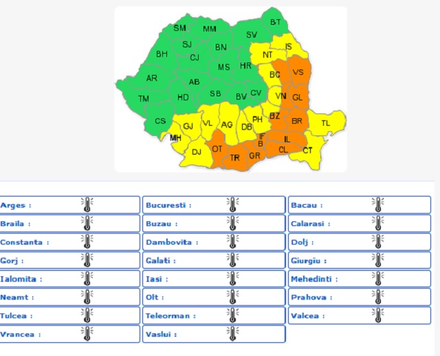 În judeţele Olt, Teleorman, Giurgiu, Ilfov, inclusiv municipiul Bucureşti, Ialomiţa, Călăraşi, Brăila, Galaţi, Vaslui, precum şi în zona de câmpie a judeţelor Bacău, Vrancea şi Buzău, temperaturile maxime vor fi de 38...39 de grade, iar disconfortul termic va fi deosebit de accentuat.