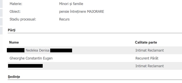 Denisa Nedelea, dansatoarea din Piteşti care face furori în casa MPFM, a deschis un proces împotriva părintelui său - Eugen Constantin Gheorghe -, solicitând instanţei să îl oblige pe acesta să achite pensia de întreţinere şi să dispună majorarea sumei. Spre ghinionul ei, a obţinut o sentinţă favorabilă - o pensie alimentară de aproape 89 de lei - abia după ce a împlinit 18 ani, aşa că minunea nu a durat prea mult. Asta pentru că Denisa nu a luat examenul de bacalaureat şi nu a continuat studiile, pentru a avea dreptul la pensie de întreţinere.