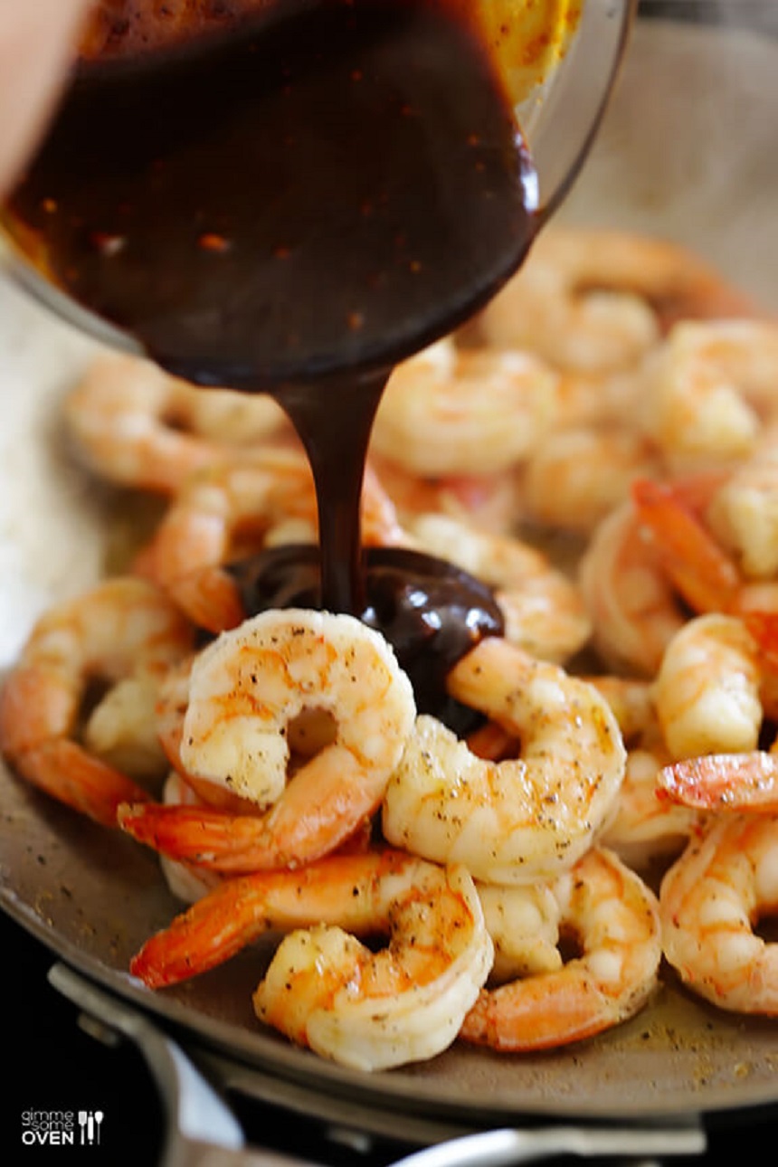 Într-un bol mediu, se pune sosul Hoisin, oțetul balsamic și sosul de soia. Se amestecă până ce toate acestea se combină perfect, apoi se lasă deoparte. Într-un bol mare, se pun creveții și se asezonează cu sare și piper.