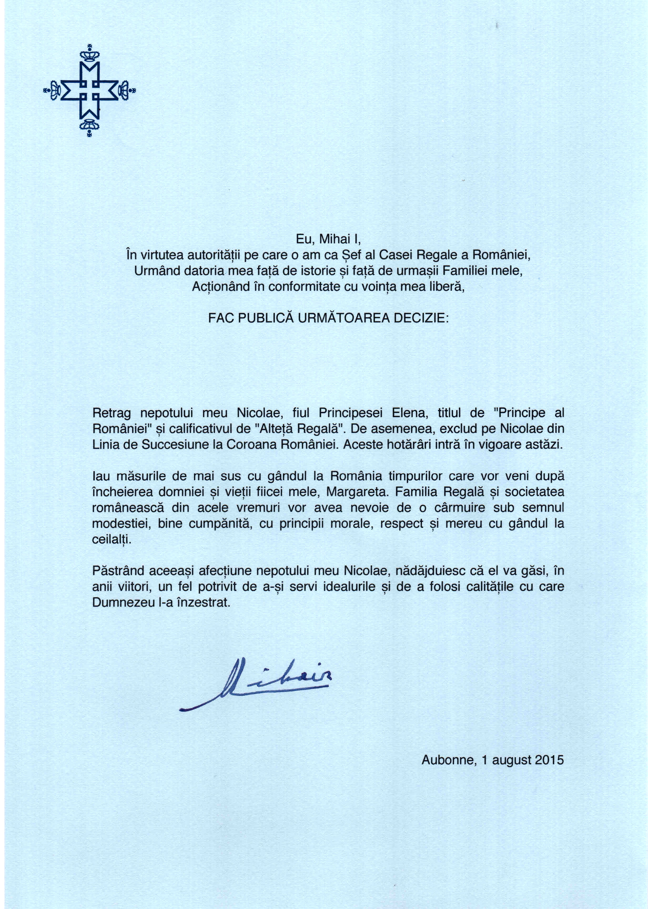 "Retrag nepotului meu Nicolae, fiul Principesei Elena, titlul de Principe al României şi calificativul de Alteţă Regală. De asemenea, exclud pe Nicolae din linia de Succesiune la Coroana României. Aceste hotărâri intră în vigoare astăzi. iau măsurişe de mai sus cu gândul la România timpurilor cere vor veni după încheierea domniei şi vieţii fiicei mele, Margareta. Familia Regală şi societatea românească din acele vremuri vor avea nevoie de o cârmuire sub semnul modestiei, bine cumpătată, cu principii morale, respect şi mereu cu gândul la ceilalţi. Păstrând aceeaşi afecţiune nepotului meu Nicolae, nădăjduiesc că el va găsi, în anii viitori, un fel potrivit de a-şi servi idealurile şi de a folosi calităţile cu care Dumnezeu l-a înzestrat", se arată în comunicatul Casei Regale - semnat la data de 1 august şi publicat astăzi.