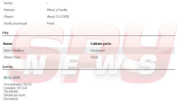 Oana Cuzino şi Yoav Stern sunt aşteptaţi în faţa judecătoriilor în dimineaţa zilei de 8 ianurie 2015, pentru a încheia mariajul început în 2001. Cu două zile înainte de această întâlnire, la o altă judecătorie, vor începe dezbaterile şi în procesul de în care omul de afaceri a cerut partajarea averii pe care o deţine împreună cu vedeta de televiziune.