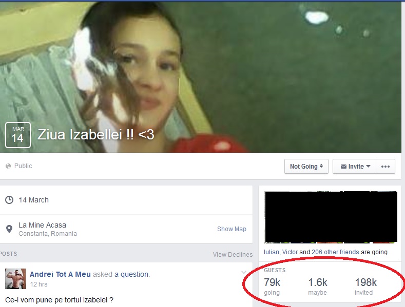 Evenimentul Izabellei din data de 14 martie a făcut rapid înconjurul ţării. Aproape 300.000 de oameni au fost invitaţi la o mega-petrecere de ziua tinerei în vârstă de doar 11 ani, din Constanţa, însă petrecăreţii au fost dezmăgiţi, astăzi, de o femeie.