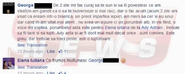 "De două zile îmi fac curaj să te sun şi să îţi povestesc ce am visat, dar o să o fac acum. Am visat că eram într-o biserică, unde un preot împărţea iepuri. Am mers să-i cer şi eu unul, dar când m-am uitat mai atent, nu era un iepure, ci un porumbel alb. În vis fiind, o voce îmi şoptea că porumbelul acesta este pentru Elena, iubita lui Adi. Trebuie să fii tare şi să lupţi, Adi asta şi-ar fi dorit mai mult decât orice, sunt convins. Este greu, dar trebuie să treci peste, eşti o luptătoare", i-a transmis George amicei lui, Elena.