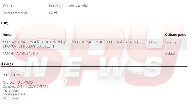Mai nou, Oana Roman ar putea fi executată silit pentru câteva sute de lei, într-un proces deschis pe numele acesteia de către Compania Naţională de Autostrăzi şi Drumuri Naţionale din România. Cel mai probabil, Oana nu a achitat la timp taxa de drum.