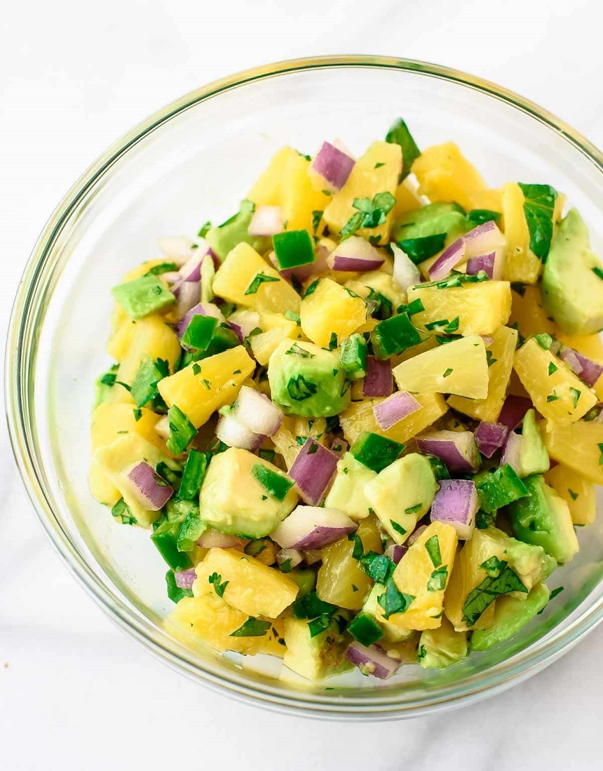 Între timp se prepară salata de ananas. Într-un bol, se combină bucăţile de ananas, ceapa roşie, ardeiul, pătrunjelul şi sarea. La final se asezonează cu suc de lămâie şi se amestecă până ce toate ingredientele se combină perfect.