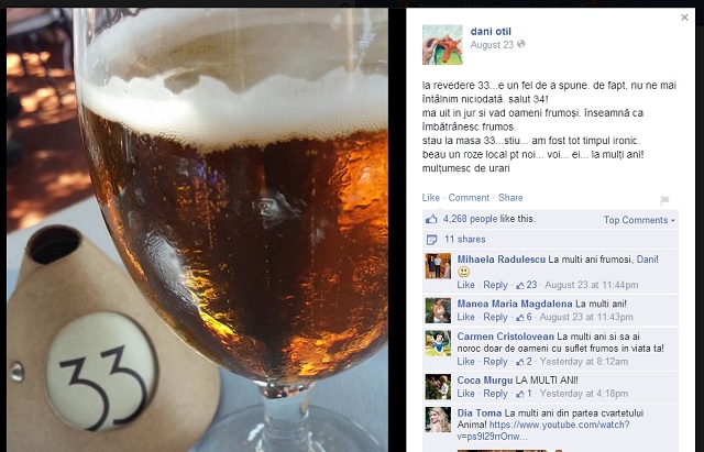 "La revedere 33...e un fel de a spune. De fapt, nu ne mai întâlnim niciodată. Salut 34! Mă uit în jur şi văd oameni frumoși. Înseamnă ca îmbătrânesc frumos. Stau la masa 33, ştiu. Am fost tot timpul ironic. Beau un roze local pt noi, voi, ei... la mulți ani!", este mesajul postat de prezentatorul tv pe site-ul personal de socializare.