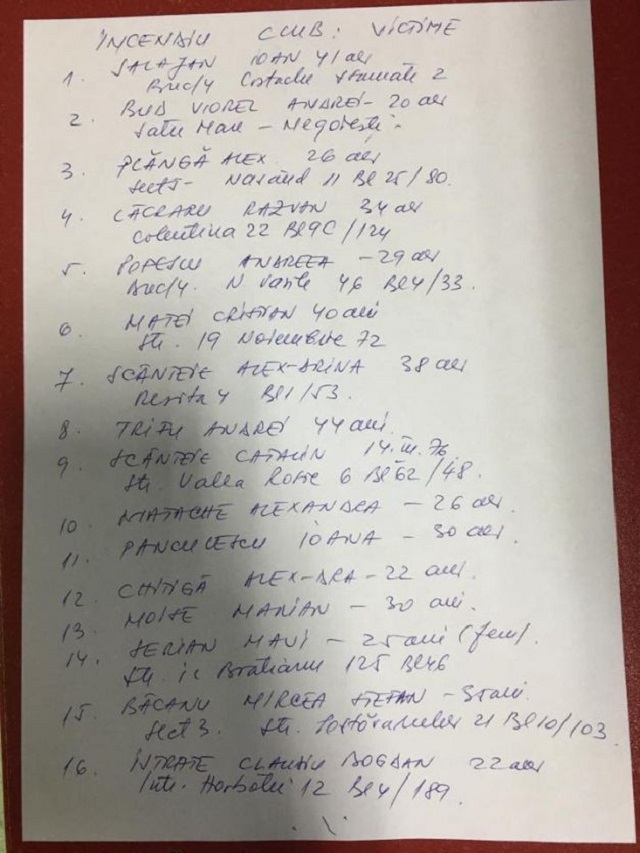 În urmă cu câteva momente, a luat foc un club din sectorul 4 din Capitală, în urma unui incendiu. Zeci de oameni au fost resuscitaţi chiar pe stradă. Mai multe echipaje de ambulanţă au intervenit la faţa locului. Prima listă corespunde victimelor din Municipal şi a doua corespunde victimelor din spitalul Griviţa.