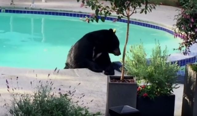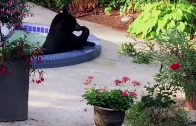 Denise şi Tony Diering, din Vancouver, Canada, a avut efectiv un şoc când au ajuns acasă şi au găsit un urs mare şi negru în piscina lor. Şi când se gândeau că animalul s-a săturat de baie şi va părăsi curtea lor, acesta s-a băgat în jacuzzi, unde a rămas o bună bucată de vreme.