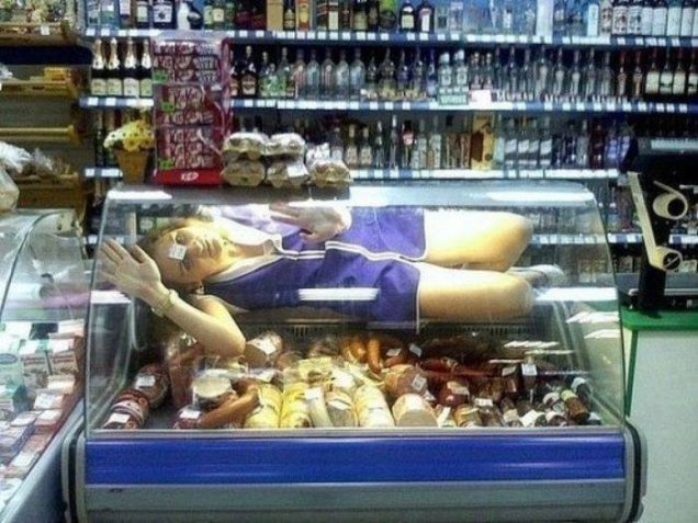 Aşa a făcut şi tânăra din imagine, angajata unui supermarket, probabil, la raionul de mezeluri. Ca să iasă în evidenţă, fata s-a urcat la propriu în vitrina frigorică, alături de câtnaţi, crenvuşti şi alte specialităşi din carne şi a rugat un coleg să imortalizeze momentul. Mândră de realizarea ei, "mezălăriţa" a postat poza pe Internet pentru a vedea reacţia prietenilor săi virtuali!