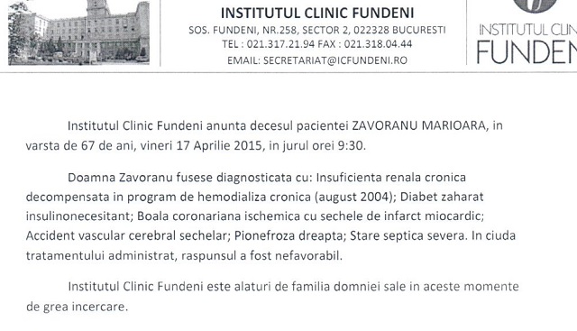 Poziţia OFICIALĂ a Spitalului Fundeni după MOARTEA Marioarei Zăvoranu