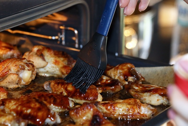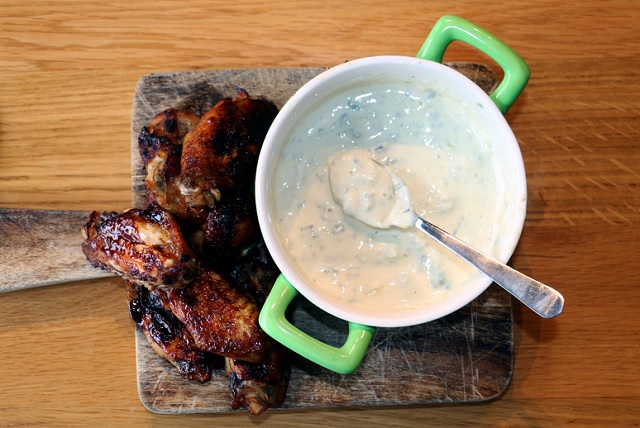După cele 15 minute ungeți fiecare aripioară fără zgârcenie cu sos barbeque și mai lasați tava încă 10 minute la cuptor. În cele 10 minute aveți suficient timp să pregătiți sosul de blue cheese.