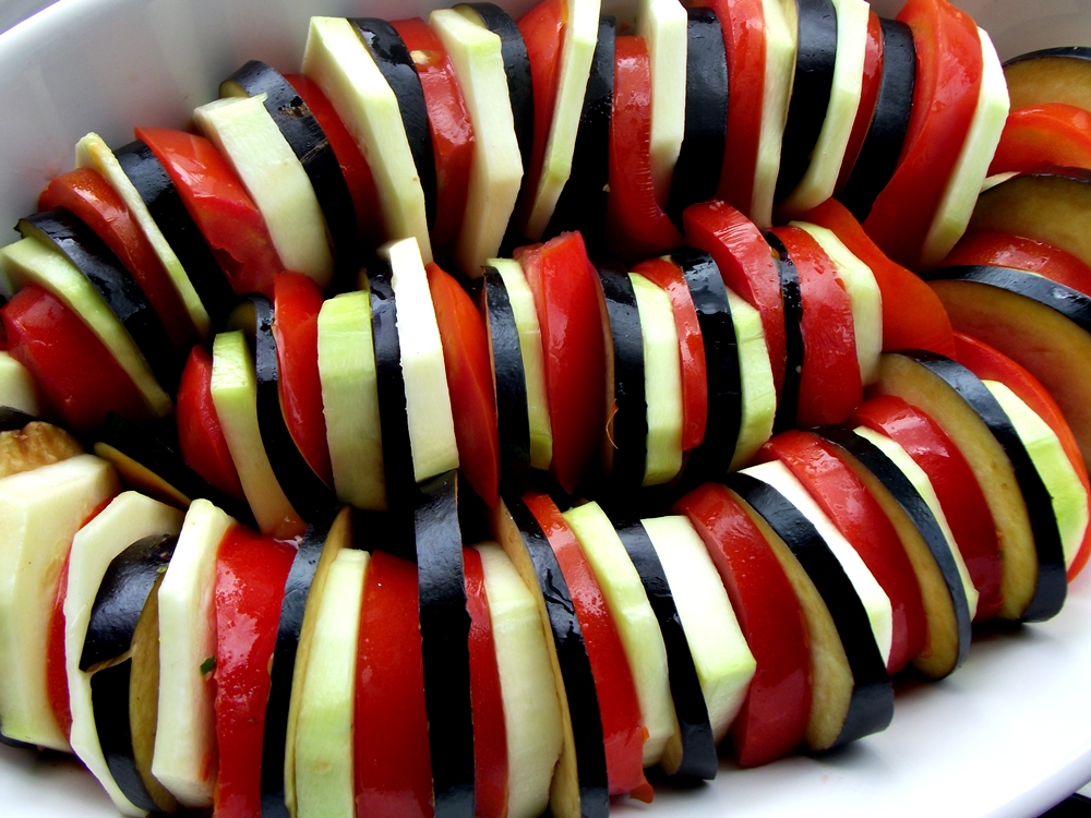 Legumele se curăţă şi se feliază rondele şi se aşează în tavă, alternate.