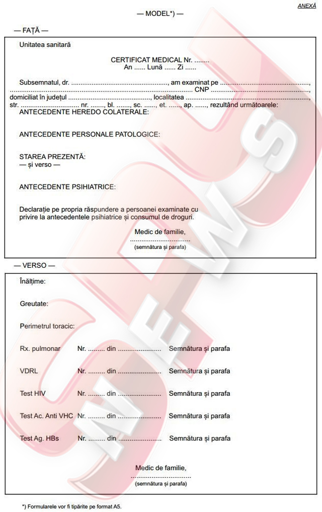 De asemenea, in noul model al certificatului medical se mentioneaza ca tinerii vor trebui sa isi faca analize pentru a se verifica daca au heptatita B si C. Anterior, tinerii nu trebuiau sa efectueze astfel de analize. Formularele certificatelor medicale se vor pune la dispozitia medicilor de familie prin Ministerul Sanatatii, la instituirea/declararea starii de asediu, mobilizarii sau starii de razboi.