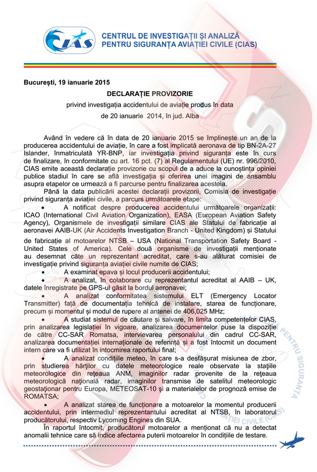 "Având în vedere că în data de 20 ianuarie 2015 se împlinește un an de la producerea accidentului de aviație, în care a fost implicată aeronava de tip BN-2A-27 Islander, înmatriculată YR-BNP, iar investigația privind siguranța este în curs de finalizare, CIAS emite această declarație provizorie cu scopul de a aduce la cunoștința opiniei publice stadiul în care se află investigația și oferirea unei imagini de ansamblu asupra etapelor ce urmează a fi parcurse pentru finalizarea acesteia. În raportul întocmit, producătorul motoarelor a menționat că nu a detectat anomalii tehnice care să indice afectarea puterii motoarelor în condițiile de testare", se arată într-un document emis astăzi de Centrul de Investigaţii şi Analiză pentru Siguranţa Aviaţiei Civile (CIAS).