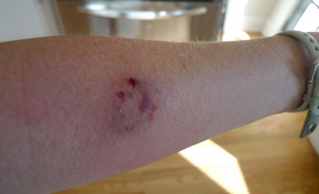 "A fost doborâtă de pe bicicletă și mușcată de gambă și mână în timp ce eu mă uitam îngrozit, cu greu am reușit să o smulg din colții ghioarlelor. Sunt circa 10 câini asociați în haită care terorizează orice drumeț, biciclist care se încumetă să treacă prin arealul lor. După cum puteți vedea, mușcăturile sunt profunde, iar în cazul în care va apărea și o suprainfectare - sunt sigur că jigodiile nu sunt vaccinate - vă promit solemn că voi veni personal în Primărie pentru a lămuri lucrurile (ar fi mai bine pentru cei care se ocupa de ecarisaj să nu fie acolo că o să îi demolez pur și simplu).
