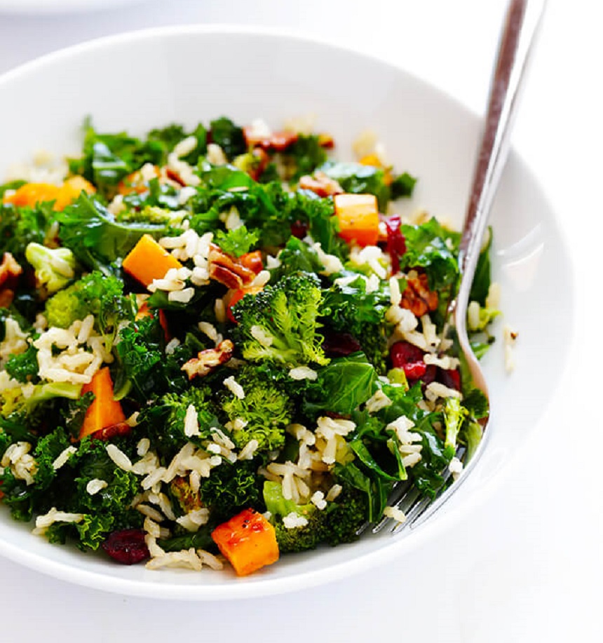 Pentru început, se preîncălzeşte cuptorul la o temperatură de 180 de grade. Într-un castron mare , se amestecă cuburile de cartofi cu o lingură de ulei de măsline. Apoi se aşează, în mod uniform pe o tavă de copt şi se introduc în cuptor. Se gătesc timp de aproximativ 15 minute. Între timp, se asezonează buchetele de broccoli cu o lingură de ulei de măsline şi se aşează în tava de copt, lângă cartofi. Se gătesc împreună timp de 15 minute până ce cartofii devin moi şi bucheţelele de broccoli se rumenesc. Se transferă legumele într-un bol de servire, apoi se adaugă orezul, merişoarele, varza şi nucile.