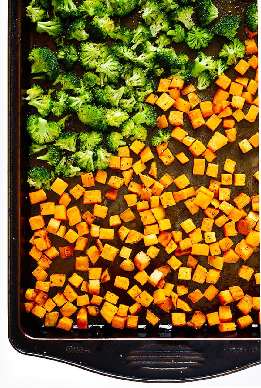 Într-un bol mic, se pun trei linguri din ulei de măsline, oţetul balsamic, 1/4 linguriţă de sare, 1/4 linguriţă de piper şi pudra de usturoi. Se amestecă până ce toate ingredientele se combină perfect, apoi se adaugă peste cartofii dulci şi broccoli. La final, se amestecă salata şi se asezonează cu brânză feta. Se serveşte imediat.