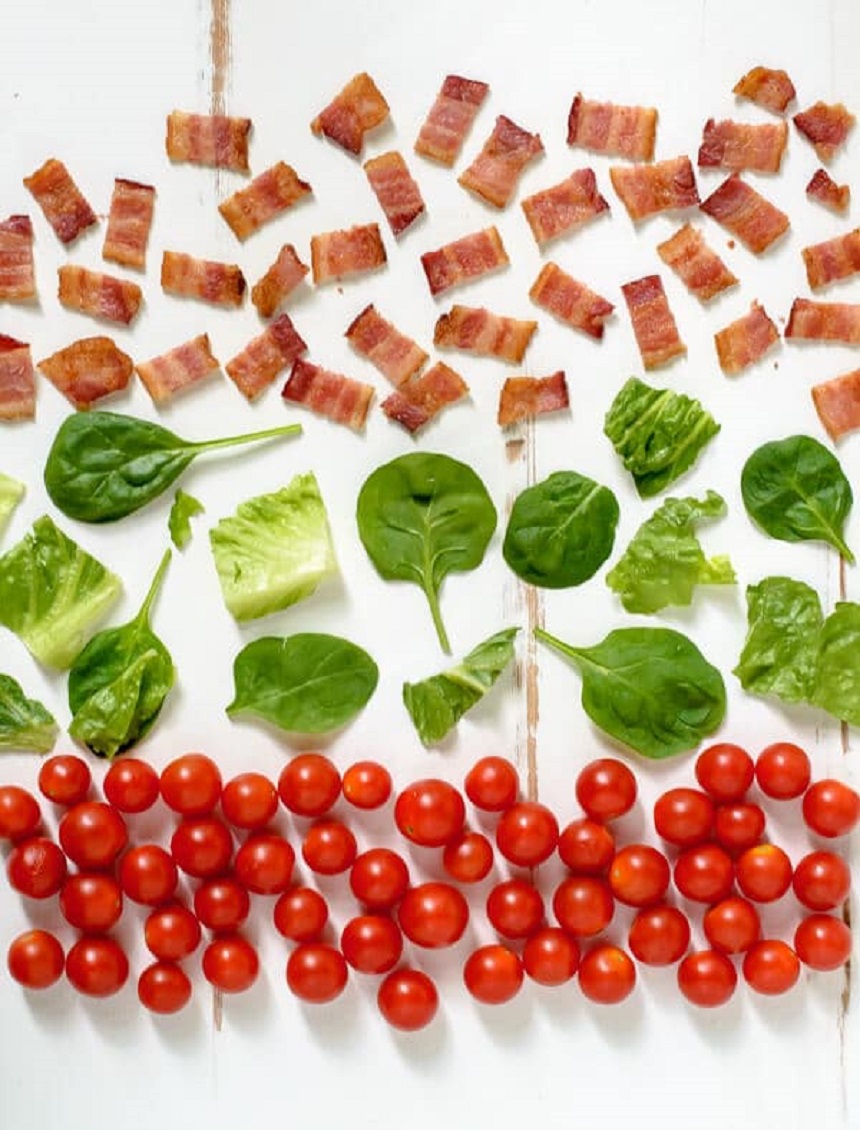 Într-o tigaie, la foc mediu se gătește baconul timp de aproximativ patru minute. După ce acesta este gata se coate pe o farfurie și se lasă deoparte. Într-o oală mare, cu apă și ½ linguriță de sare se gătesc pastele conform instrucțiunilor de pe ambalaj. După ce acestea au fiert se clătesc sub un jet de apă rece și se pun într-un bol de servire. Într-un castron mic se combină sosul de muștar, iaurtul și piperul. Apoi se toarnă sosul obținut peste paste și se amestecă până ce ingredientele se combină. Se adaugă roșiile cherry tăiate în jumătate, salata și spanacul. Se asezonează cu ceapă verde și se servește imediat.