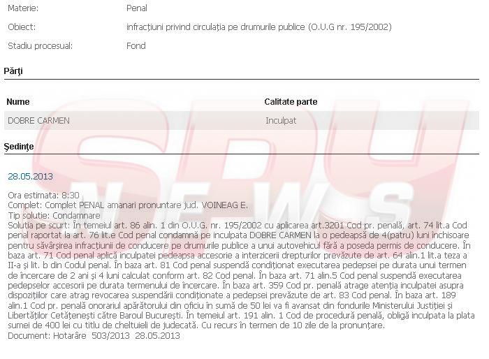Anul trecut instanţa a condamnat-o "pe inculpata Dobre Carmen la o pedeapsă de 4(patru) luni închisoare pentru săvârşirea infracţiunii de conducere pe drumurile publice a unui autovehicul fără a poseda permis de conducere". Judecătorii au suspendat însă executarea pedepsei.