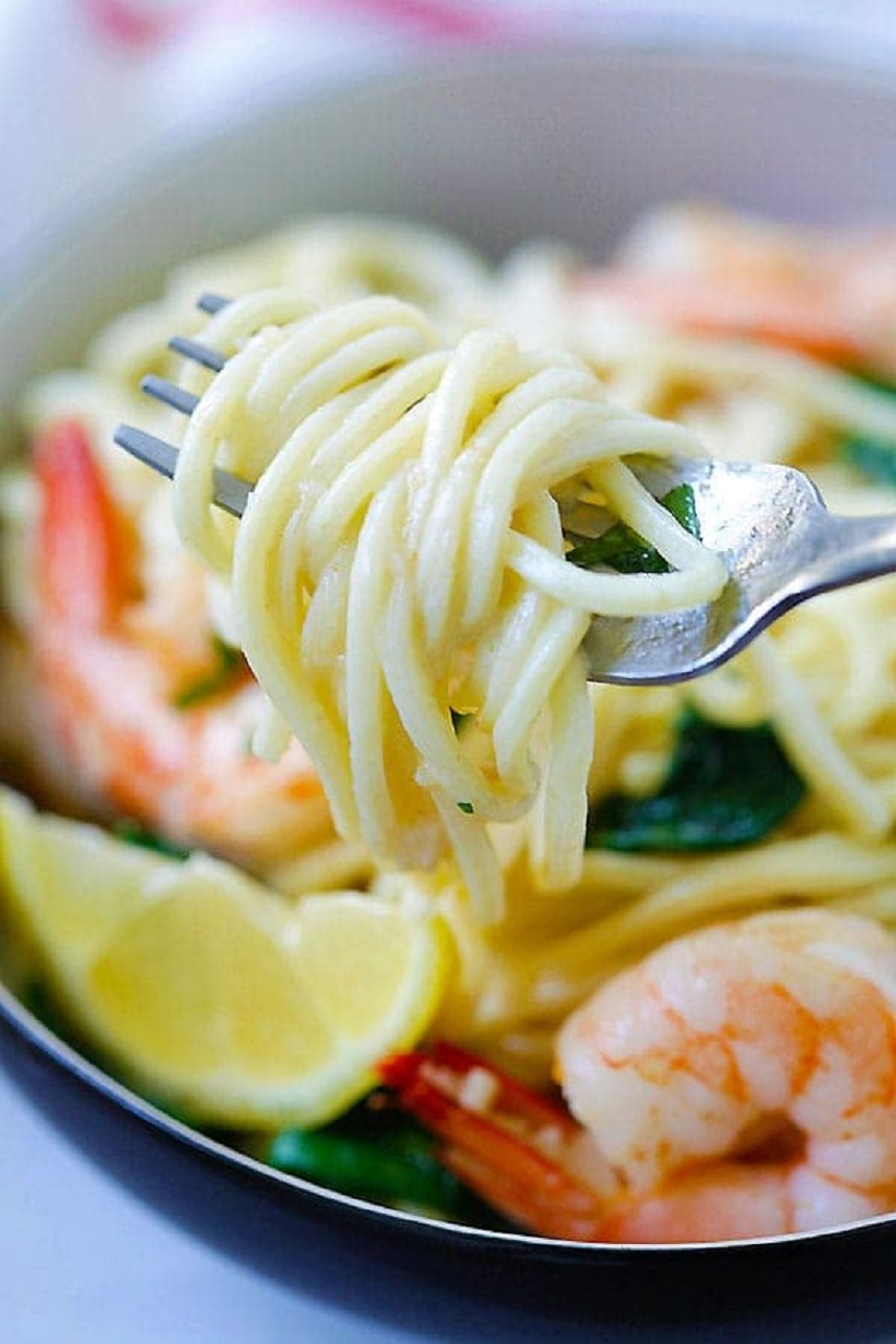 Se gătesc spaghetele conform instrucțiunilor de pe ambalaj. După ce acestea sunt gata se clătesc sub un jet de apă rece. Într-o tigaie se încălzește unutul și uleiul de măsline, la foc mediu. Se adaugă usturoiul și se călește timp de aproximativ două minute. Se adaugă creveții și se lasă pe foc timp de 8-10 minute. Când aceștia sunt gata se adaugă ½ cană de apă, vinul, sarea, spanacul și pastele. Se amestecă până ce toate ingredientele se combină. Se îndepărtează de pe foc și se adaugă pătrunjelul proaspăt. Se servesc imediat alături de câteva felii de lămâie.