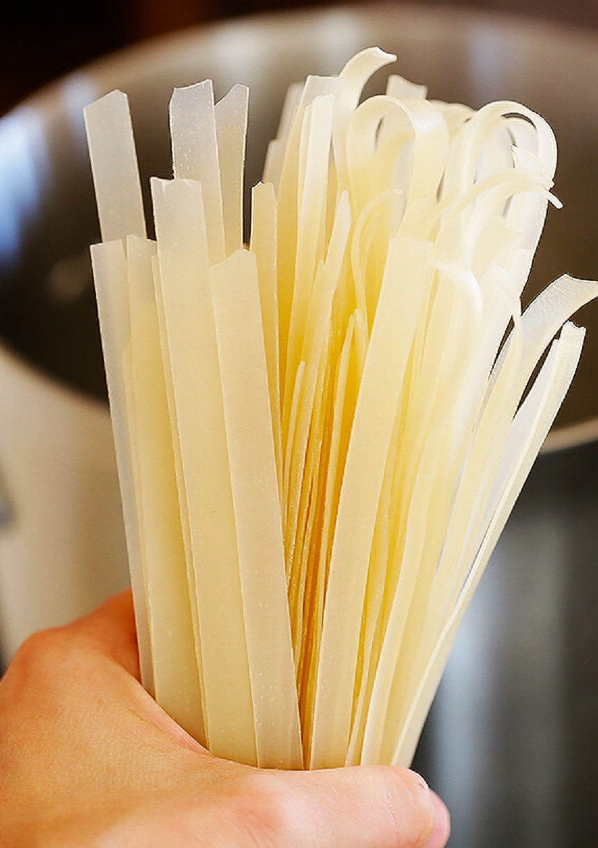 Într-o oală cu apă şi sare, se gătesc tăiţeii de orez conform instrucţiunilor de pe ambalaj. După ce acestea sunt gata, se clătesc sub un jet de apă rece şi se lasă deoparte. Într-un bol, se combină usturoiul, sosul de soia, oţetul balsamic, ghimbirul, sosul de chili, amidonul de porumb, bicarbonatul de sodiu şi 1/2 linguriţă de sare. Se amestecă până ce toate ingrediente se combină, apoi se adaugă bucăţile de carne. Se acoperă castronul cu folie alimentară şi se refrigerează timp de aproximativ 30 de minute.