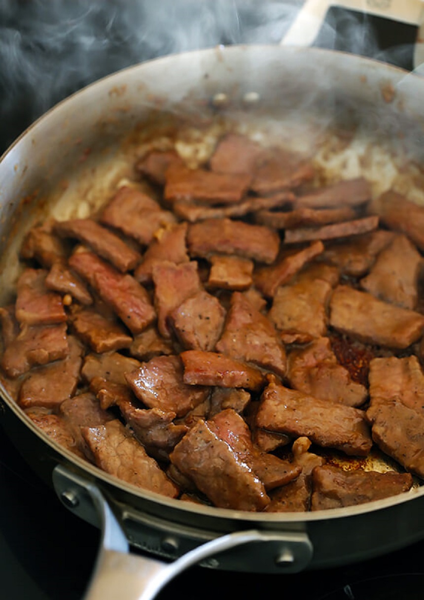 Într-o tigaie, se încălzeşte uleiul vegetal, apoi se adaugă carnea de vită. Se găteşte, timp de aproximativ cinci minute, la foc mediu, până ce bucăţile de carne se rumenesc. După ce aceasta este gata, se transferă pe un platou şi se lasă deoparte.