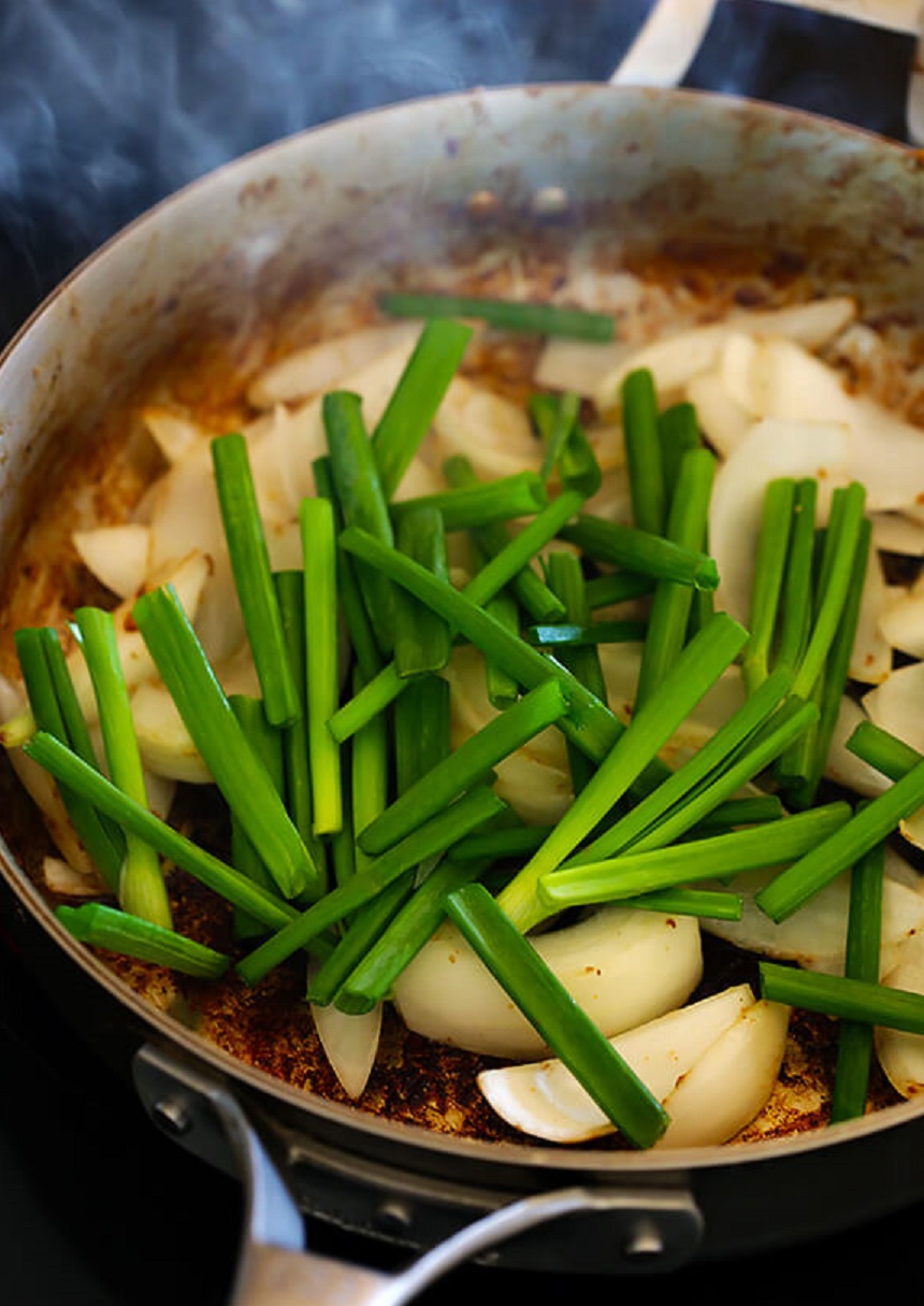 În aceeaşi tigaie, se adaugă ceapa şi se căleşte timp de aproximativ două minute. Apoi se adaugă germenii de fasole, ceapa verde şi uleiul de susan. Se găteşte timp de aproximativ trei minute. Peste amestecul din tigaie, se adaugă tăiţeii şi carnea de vită, se asezonează cu sare, piper şi sos de chili şi se mai ţine pe foc aproximativ 2-3 minute. Se servesc imediat.
