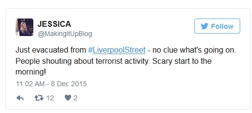"Tocmai am fost evacuaţi din Liverpool Street. Nu am nicio idee ce s-a întâmplat. Se auzeau oameni strigând ceva despre un atac terorist. Un început de zi înfricoşător", este mesajul postat pe Twitter de un călător prezent la incident.