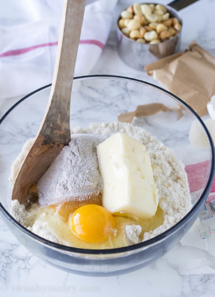 Se preîncălzeşte cuptorul la o temperatură de 170 de grade. Într-un bol se combină zahărul, budinca, untul şi oul. Se amestecă până ce toate ingredientele se combină perfect şi se obţine un aluat omogen. Apoi se aşează compoziţia obţinută într-o tavă de copt şi se introduce în cuptor. Se coace timp de 20 e minute. Între timp, într-o cratiţă mare se combină caramelul şi laptele. Se şine la foc mediu până ce caramelul se topeşte complet şi se obţine un un amestec cremos. Se îndepărtează tigaia de pe foc şi se adaugă esenţa de vanilie. Crema obţinută se toarnă în mod uniform peste aluat. Deasupra se presară alunele şi caju-ul. Se lasă să se răcească complet înainte de servire.