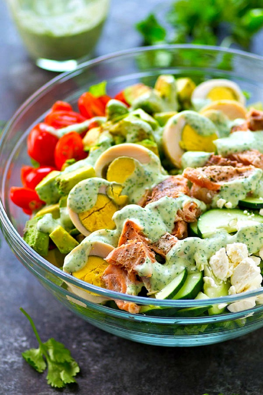 Fileul de somon se unge pe ambele părți cu ulei de măsline și se condimenteză cu pudra de usturoi, condimentele italiene, sarea și piperul. Se găteste la foc mediu timp de aproximativ 4-5 minute pe fiecare parte, După ce acesta este gata se taie în bucăți mici și se lasă deoparte. Într-un bol mediu se combină salata, ouăle, roșiile, castravetele, avocado, ceapa verde și brânza. Apoi în vasul unui blander se pun: maioneza, iaurtul grecesc, laptele, sucul de lămâie și pătrunjelul. Se mixează până ce toate ingredientele se combină perfect și se obține o compoziție omogenă. Adăugați amestecul de iaurt peste salată. Se servește imediat.