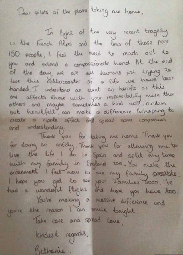 (...) Vă mulţumesc că m-aţi dus acasă. Vă mulţumesc că m-aţi adus în siguranţă. Vă mulţumesc că aţi făcut tot posibilul ca eu să îmi trăiesc viaţa pe care o am în Spania şi să-mi petrec timpul alături de familia mea în Anglia. (...) Sper să vă revedeţi curând familiile. Am avut un zbor minunat şi sper că şi pentru voi a fost la fel. (...)", sunt doar câteva dintre gândurile pe care i le-a scris Bethania celor doi piloţi.