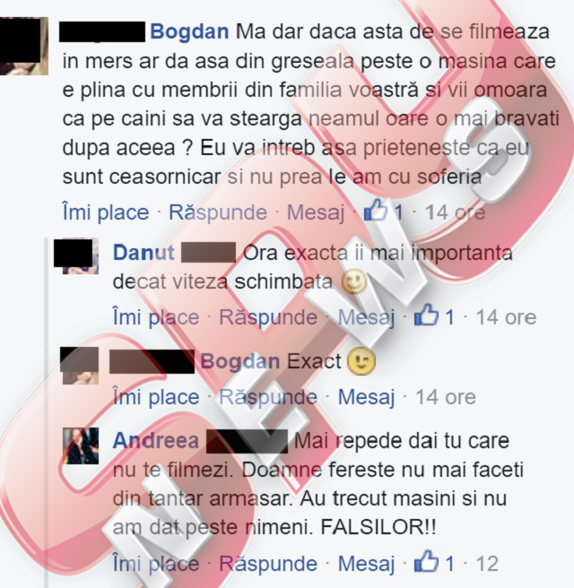"Mai repede dai tu, care nu te filmezi. Doamne, fereşte, nu mai faceţi din ţânţar armăsar. Au trecut maşini şi nu am dat peste nimeni. Falşilor!", a replicat focoasa conducătoare auto.