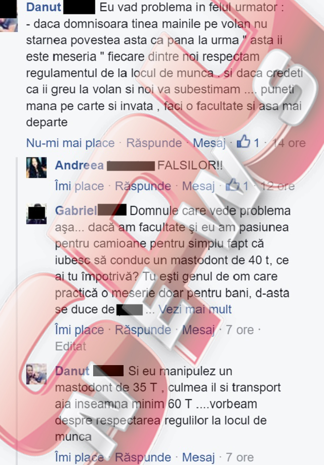 "Îmi iubesc meseria şi camionul! Nu o să renunţ niciodată, oricât de greu mi-ar fi, eu m-am născut pentru asta şi ca să vă arăt că nimic nu este greu sau imposibil, atunci când îţi doreşti cu adevărat să faci un lucru! Vă doresc drumuri bune! Pentru cei care nu înţeleg, acest video l-am făcut pentru cei care m-au criticat în urma scandalului", scris în spaţiul virtual Andreea, şoferiţa despre care SPYNEWS a dezvăluit că îşi făcea selfie-uri la volanul unui camion, în timpul mersului.