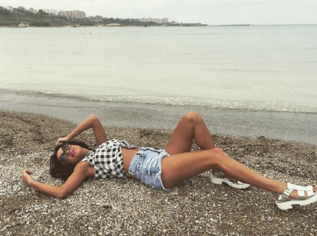 Îmbrăcată cu o cămășuță, o pereche de pantaloni scurți și cu ochelari de soare, Daniela Crudu s-a unduit pe nisip și s-a lăsat fotografiată.