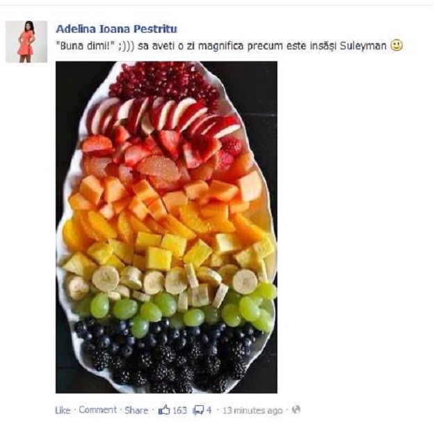 Adelina a avut o evoluţie fulminantă în carieră, iar în unele momente, ascensiunea nu poate fi justificată. Bruneta a dorit să le ureze o zi bună fanilor, făcând o comparaţie pe care o considera reuşită. Din nefericire, gramatica limbii române i-a stat în cale. "Bună dimi! Să aveţi o zi magnifică precum ÎNSĂŞI Suleyman!", a scris ea pe Facebook. De aici putem trage două concluzii: Adelina ori are o problemă cu identificarea sexului, ori a cam chiulit de la orele de gramatică.