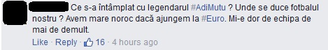 Cariera fotbalistului a fost controversată, la fel ca şi stilul de viaţă periculos pe care acesta l-a avut. Un fan nemulţumit de cum îşi exploatează talentul şi-a exprimat părerea la o poză cu Adrian şi iubita sa în ipostaze tandre. "Vă dorim o zi la fel de frumoasă ca şi a noastră! We are wishing you a day as beautiful as our! :) AMSM", a fost descrierea pe care fotbalistul a corectat-o ulterior. "Ce s-a întâmplat cu legendarul Adi Mutu? Unde se duce fotbalul nostru? Avem mare noroc dacă ajungem la Euro. Mi-e dor de echipa de mai de mult", a scris acesta. Deşi acest comentariu ar fi avut potenţial pentru pornirea unei mari discuţii, acesta a primit 16 like-uri.
