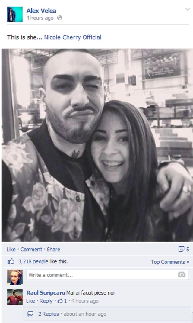 Chiar dacă mesajul este în limba engleză, cântăreţul tot a fost criticat de către un fan. Alex a făcut o poză împreună cu Nicole Cherry şi, în descrierea ei, voia să parafrazeze versul unei melodii de-ale micuţei cântăreţe - "This is me, Nicole Cherry" (Asta sunt eu, Nicole Cherry) -, dar a greşit. "This is she...Nicole Cherry" , a scris Velea, însă un fan a ţinut să-l corecteze: "This is her" (Aceasta este ea), a scris admiratorul, drept comentariu la această poză.