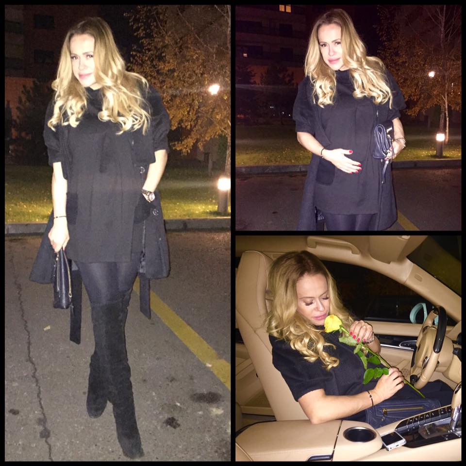 În imagini, artista apare îmbrăcată într-o rochie scurtă, de culoare neagră, largă, la care a asortat o pereche de colanţi şi nişte cizme din piele întoarsă de aceeaşi culoare. Burtica de graviduţă pare inexistentă, fiind bine mascată de ţinuta lejeră.