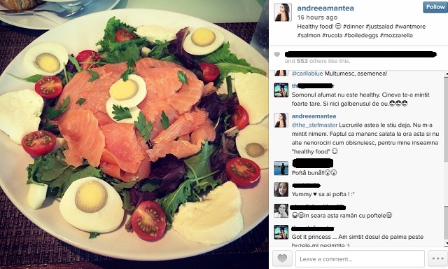 Frumoasa brunetă şi-a postat pe contul de socializare o fotografie cu o salată din somon afumat, ouă şi legume. Prietenii virtuali s-au grăbit să o avertizeze că ingredientele din salată nu sunt tocmai dietetice. Andreea Mantea şi-a dezvăluit "păcatele" spunând că de obicei consumă mâncăruri nesănătoase, iar cina de ieri seară a fost chiar sănătoasă.