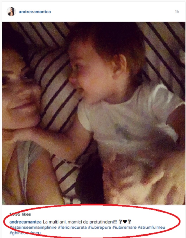"La mulţi ani, mămici de pretutindeni. Asta înseamnă împlinire. Fericire curată. Iubire pură. Iubire mare. Ştrumful meu. Ghindocul meu", este mesajul transmis de Andreea Mantea mămicilor din lumea întreagă.