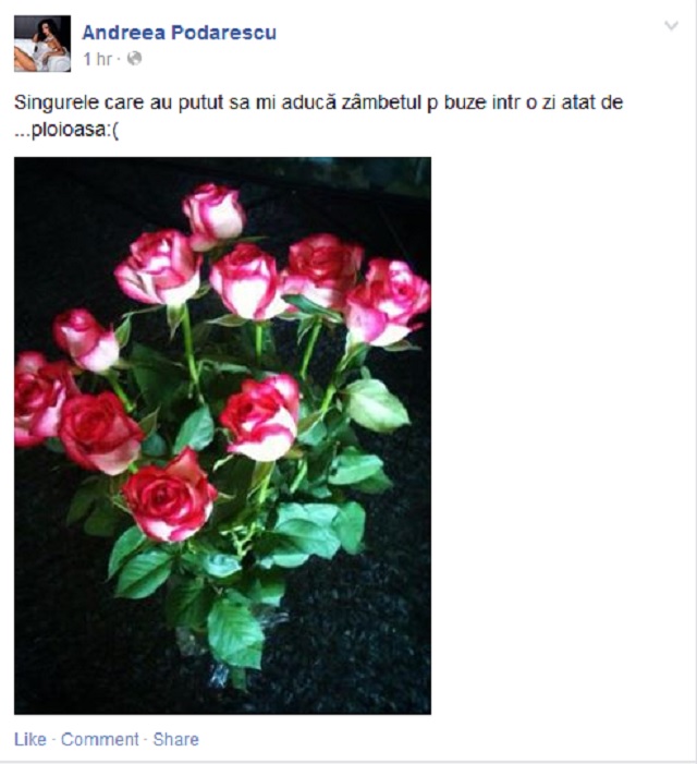 Bruneta a spus că doar florile acestea au reuşit să-i aducă zâmbetul pe buze într-o zi ploioasă ca aceasta. Simona Traşcă a empatizat cu frumoasa Andreea şi i-a dat imediat like, semn că nici ea nu se simte în largul ei când nu e soare.