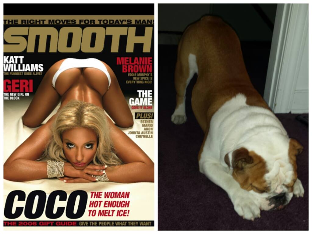 Coco a postat pe internet un colaj foto cu o fotografie super hot cu ea şi una cu poziţia căţelului ei. Amuzată de semănare aceasta a spus: "Sunt eu sau băiatul meu, regele Max, încercând să-mi fure poziţia?".
