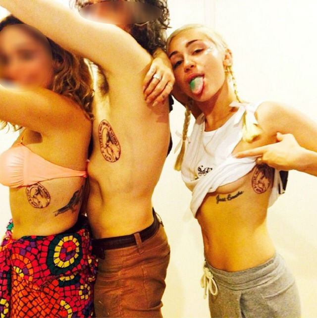 Cântăreaţa şochează în toate concertele pe care le suţine. Mimează sexul şi sexul oral cu păpuşi gonflabile, penisuri şi banane din plastic, dansează lasciv şi se îmbracă sumar. Mai mult decât atât, blonda a demonstrat că nu numai pe scenă are comportament vulgar. Recent, Miley a pus pe contul ei de socializare o imagine cu ea şi prietenii de la o petrecere dată în apartamentul său. Ea stă cu limba scoasă şi verde pe un amic de-ai ei care s-a dezbrăcat la bustul gol şi şi-a expus părul de la subraţ în toată splendoarea şi care, la rândul său, se sprijină pe o altă domnişoară, îmbrăcată doar cu un sutien şi o fustă. Miley şi-a ridicat maioul, lăsând la vedere o porţiune din sân.