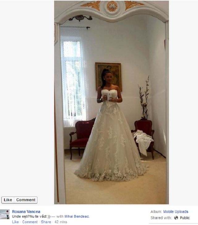 Apetisanta şatenă a pus, pe contul ei de socializare, o fotografie cu ea îmbrăcată în rochie de mireasă şi, mai mult decât atât, i-a dat şi "tag" lui Mihai Bendeac, eea ce i-a făcut pe admiratorii săi să se gândească la un singur lucru: o posibilă nuntă între cei doi, în viitorul apropiat. Fosta "vecină" pare că se află într-un magazin de specialitate, probând de zor rochii pentru marele eveniment. "Unde ești?Nu te văd!:)) — with Mihai Bendeac.", a scris Roxana, pe Facebook.