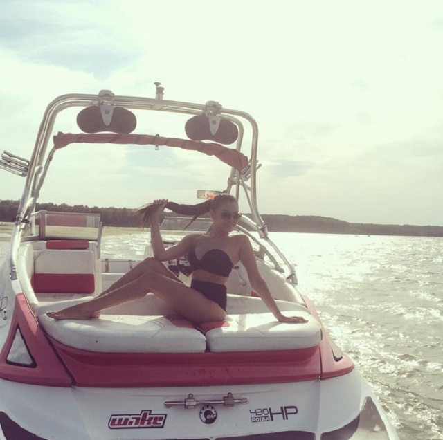 Îmbrăcată numai într-un costum de baie negru, fiica manelistului stă întinsă pe o barcă de viteză și zâmbește la cameră, iar fanii au crezut că a plecat într-o ținută exotică, pentru a scăpa de codul portocaliu de ninsori.